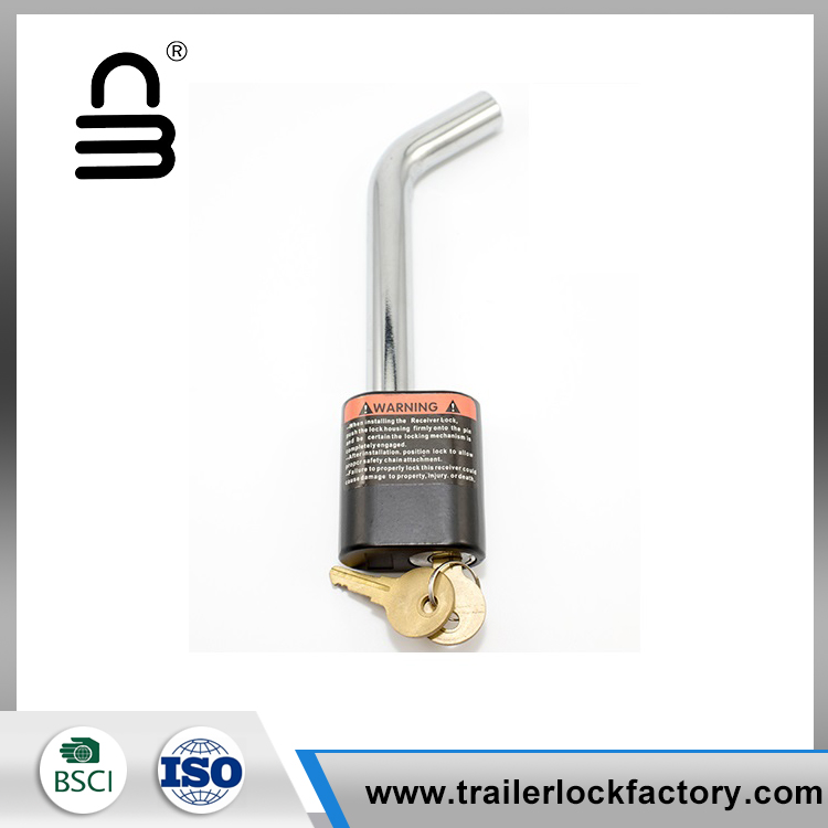 பந்து மவுண்ட் அல்லது ஹிட்ச்-பொருத்தப்பட்ட துணை திருட்டு தடுக்க நிலையான முள் மற்றும் கிளிப்பிற்கு பதிலாக வளைந்த-முள்-பாணி டிரெய்லர் ஹிட்ச் ரிசீவர் பூட்டு பயன்படுத்தப்படுகிறது