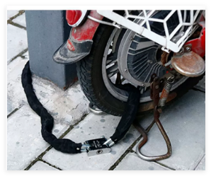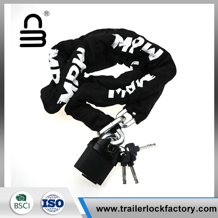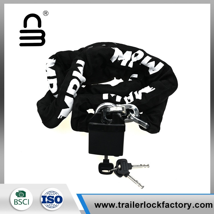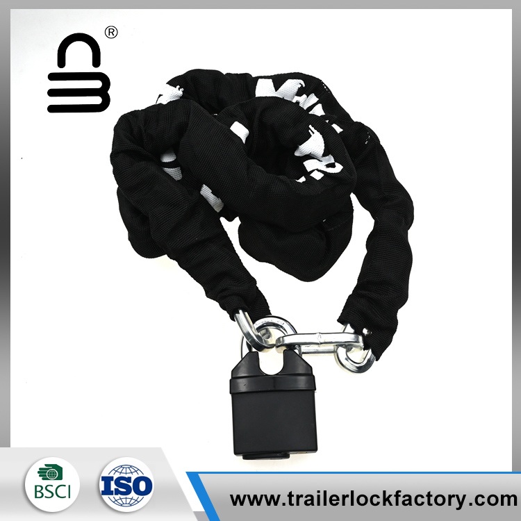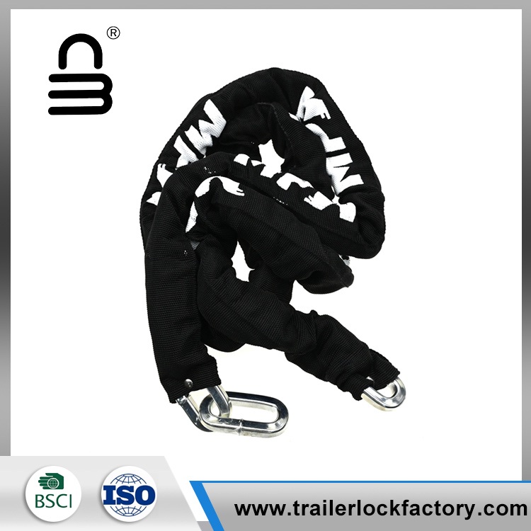 கீறல்களைத் தடுக்கவும், நீண்ட ஆயுளை மேம்படுத்தவும், பைக் சங்கிலி பூட்டு கடினமான, உடைகள்-எதிர்ப்பு துணி ஸ்லீவ் மூலம் மூடப்பட்டிருக்கும். கூடுதல் பாதுகாப்பிற்காக, பைக் சங்கிலி பூட்டில் யு-வடிவ பூட்டுதல் பொறிமுறையுடன் பொருத்தப்பட்டுள்ளது, இது யு-லாக் ஹூக்ஸ் என்றும் அழைக்கப்படுகிறது, இது நம்பகமான மற்றும் பாதுகாப்பான கட்டும் முறையை வழங்குகிறது.